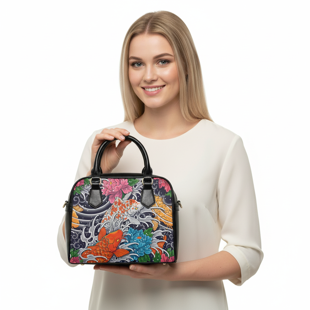 Celebrate the beauty of Japanese artistry with this Koi Fish Handbag, a stunning accessory inspired by traditional tattoo motifs and symbolic koi imagery. The bag features vividly illustrated koi fish swimming among vibrant floral patterns, representing strength, perseverance, and good fortune in Japanese culture.