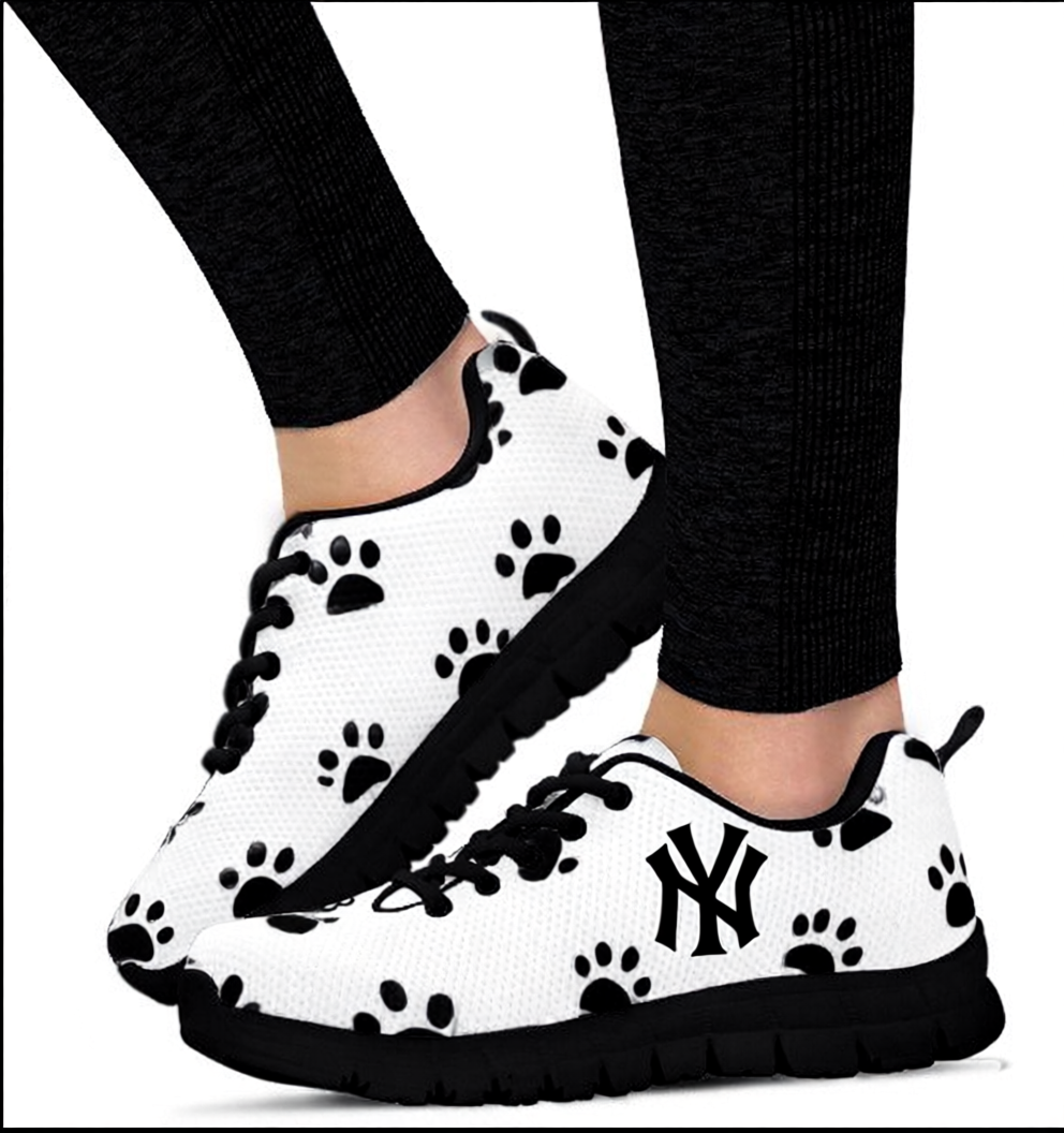 • White sneakers with all-over black paw prints