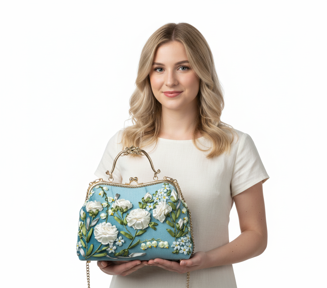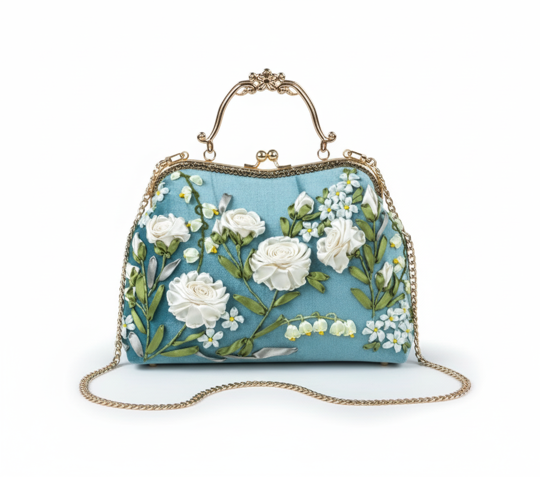 Step into timeless elegance with the Vintage Blue Floral Embroidered Handbag, a masterpiece of artistry and sophistication. Crafted from high-quality fabric in a serene pastel blue shade, this purse is exquisitely adorned with 3D white rose embroidery, symbolizing purity and grace. The intricate floral details are carefully hand-stitched, giving the bag a refined, romantic charm.
