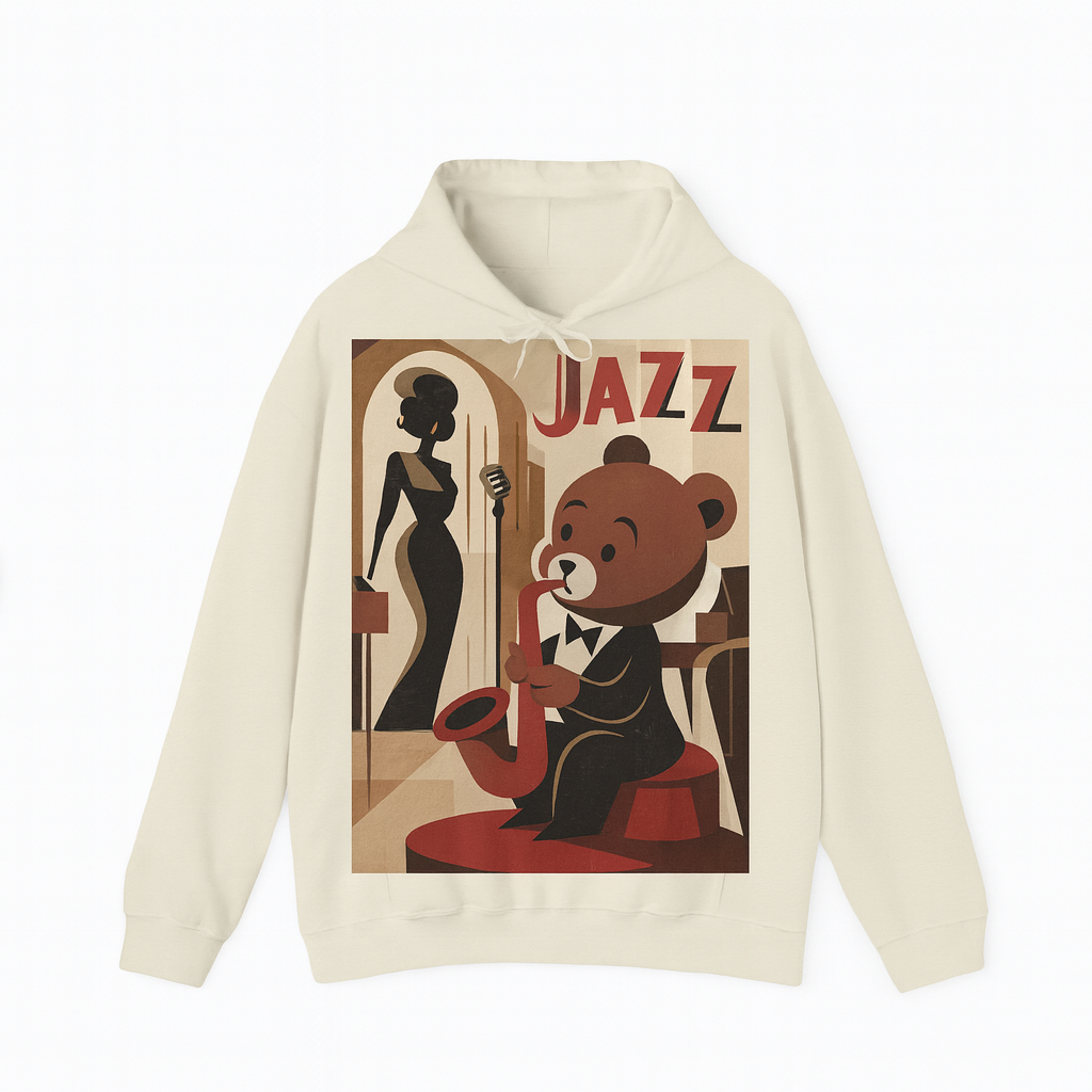 The hoodie showcases a charming illustration of a teddy bear dressed in a tuxedo, playing the saxophone on stage. Behind the bear, a graceful female jazz singer stands poised by a vintage microphone, creating a lively yet elegant jazz club scene. The artwork, framed in warm tones of brown, beige, and red, is highlighted by the bold lettering βJAZZβ at the top, making this hoodie both eye-catching and full of character.